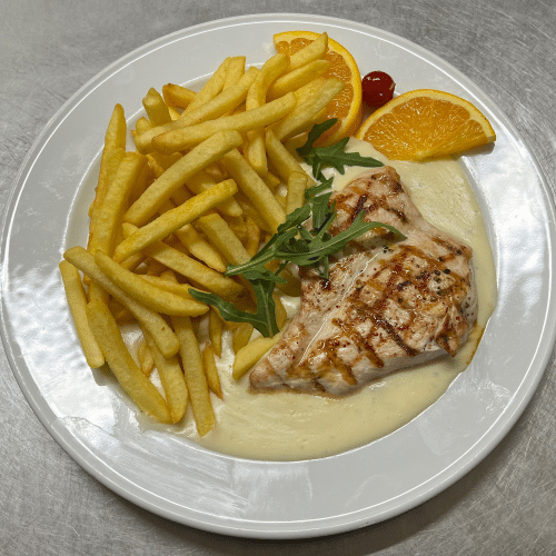 Kleine Hähnchenbrustfilet mit Pommes und hausgemacht Sauce